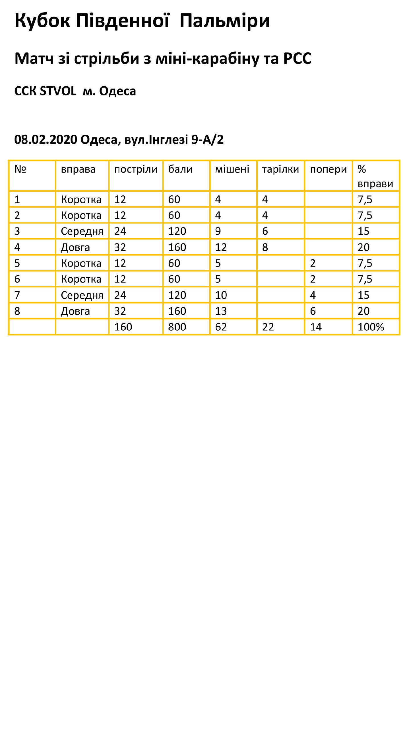 Шановні стрільці! Спортивно Стрілецький клуб STVOL та Центр Стрілецької Підготовки «Одеса» запрошує вас взяти участь в матчі на Кубок Південної Пальміри з практичної стрільби з карабіна РСС та міні Карабіна, який відбудеться 8 лютого 2020 року в Одесі в тирі STVOL.